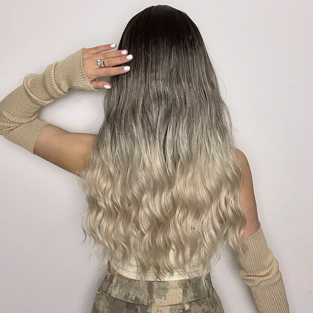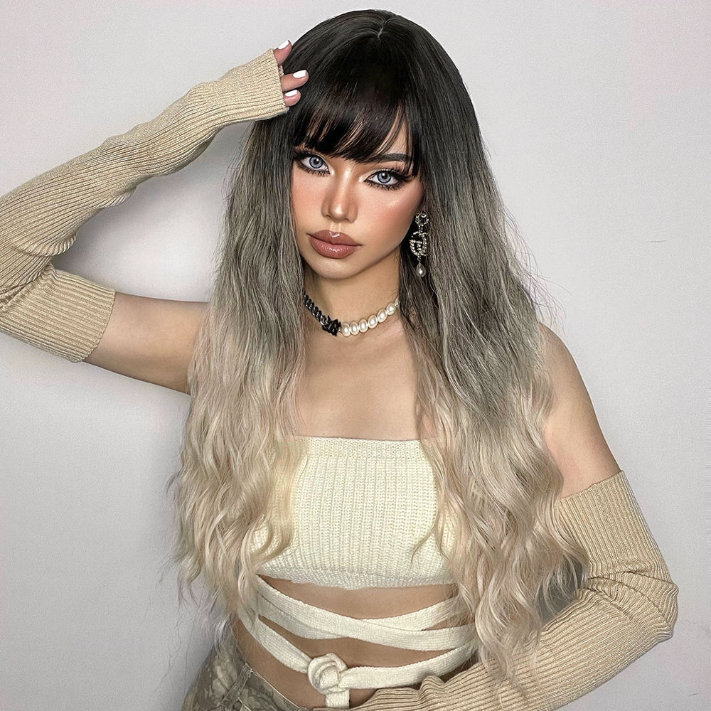 Grey Brown Loose Wave Synthetic Wigs With Bangs 26"